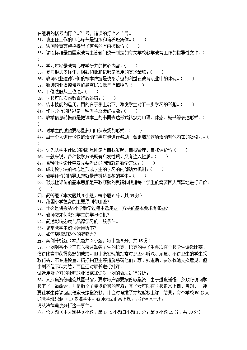 2007年河南教師資格小學(xué)教育學(xué)真題及答案A(Word版)